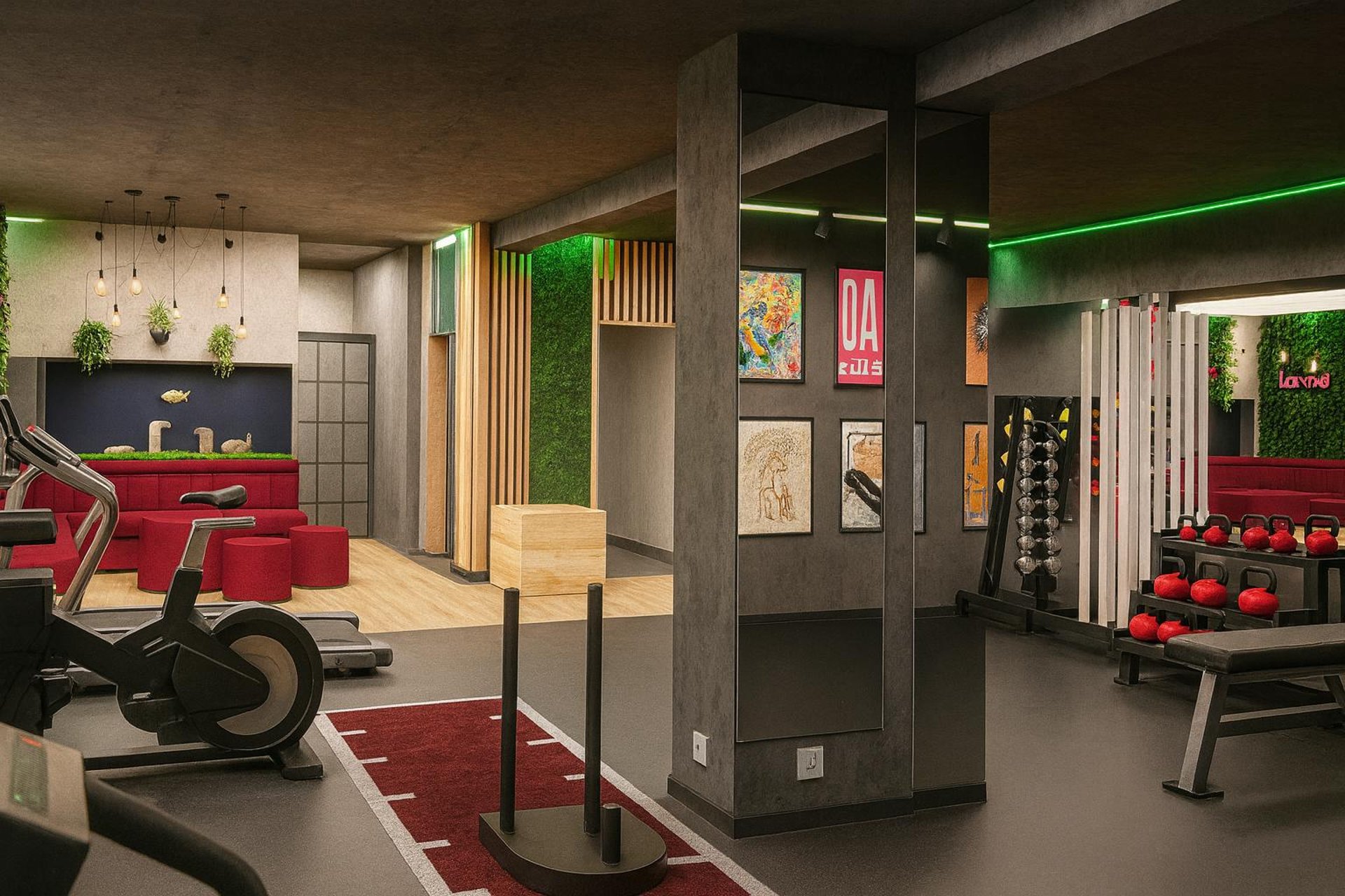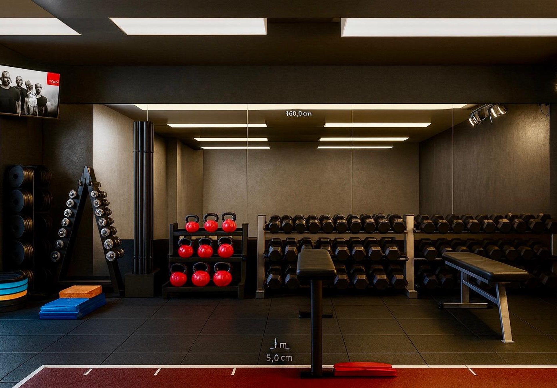 Strefa treningowa została zaprojektowana w sposób otwarty i czytelny, z wyraźnym podziałem na obszary cardio, treningu siłowego oraz ćwiczeń funkcjonalnych. Wysokiej klasy sprzęt fitness, ergonomicznie rozmieszczony, zapewnia swobodę ruchu i bezpieczeństwo użytkowania. Lustra optycznie powiększają przestrzeń i wspierają kontrolę techniki ćwiczeń, a profesjonalne oświetlenie liniowe podkreśla nowoczesny charakter wnętrza.
